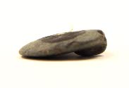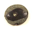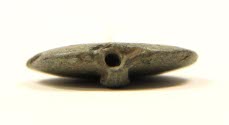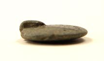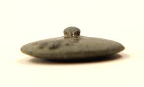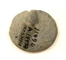 DescriptionGrey stone disk with raised point at one side. Hole under raised point but does not go through. Diameter 3.2 x 3.6 cm.On View