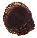 DescriptionPurple velvet, shaped brim, large crown. Large velvet decoration on side. Upper side of brim of wedge-shaped folds of emb. braid and velvet. Lining of shattered silk taffeta.On View