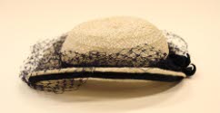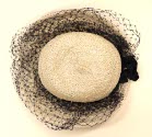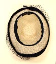 DescriptionWhite straw (cellulose) "derby." Trimmed with navy grosgrain ribbon and veiling. Label: Marguerite Yvonne, N.Y.On View