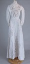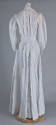DescriptionLingerie dress - white linen with eyelet front bodice, cuffs and front skirt. Tucks. Long sleees. High eyelet collar with lace edging. Back buttons and hooks. Stamped, hand done. Store bought lace. Machine seams.On View