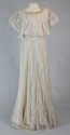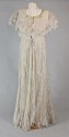 DescriptionWhite embroidered net with square neck bound in pale green velvet ribbon. Short sleeves. Gored skirt with flounce. Back snaps and hooks. Lined in silk. Machine chain stitch on machine ground looks Eng. Colony pattern. Velvet edge - hand basted - was added later. Snaps - date? Hem - machine stitched. Gathering thread not taken out.On View