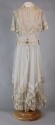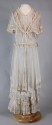 DescriptionWhite net embroidered net trim. U-neck. Attached over-vest of embroidered net with crocheted drops. Short sleeves. Double skirt top with tucked and embroidered net with handkerchief points. Under skirt has two flounces trimmed with embroidered net.On View