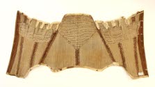 DescriptionStays, of brown linen. Handmade. Bound in white leather. Sides split over hip area. Handmade eyelets. Laces up back.On View