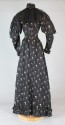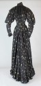 DescriptionTwo Piece black silk lined in cotton. Pink and yellow flower print. Trimmed with black lace. High collar, sleeves, leg-of-mutton. Bodice pointed in front and back. Skirt-plain front, gathers in back. Two small ruffles on hem.On View