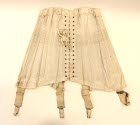 DescriptionWhite cotton corset. Laces up back. Hooks up front. Two front garters set together and two side garters. Eyelet trim on top. Trade mark royal worcester reg. US pot off style 442 Non-pinching. Also patented in other countries. Double boning in front sections. Patented Oct. 23 1917 US of America.On View