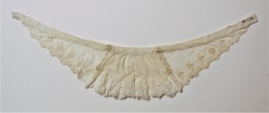 DescriptionWhite lace, pleated in back with two wires holding it upright. Tapers at ends.On View