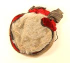 DescriptionTiny white fake fur, red velvet band above tiny brim. Sheer silver ribbon under red band. Red flowers. Lined in white silk.On View