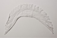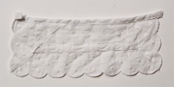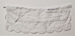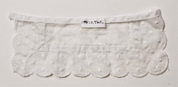 DescriptionWhite cotton dotted, large and small dots, scalloped edge. Shawl collar (a), cuffs (b, c).On View