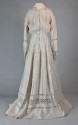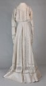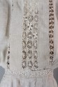 DescriptionNatural linen. Bodice has shoulder tucks, square neckline with drawn thread work and needle lace. Long sleeves have tucks and lace and drawn lace inserts. Set-in waistband; skirt has tucks which are open below hip level. Skirt has drawn thread work with needle lace. Back placket hooks.Hem stitching-drawn work - Needle weaving bobbin lace on cuff and waist, neckline and inserts: center panel just pulled lookes unfinished off grain when means cut.