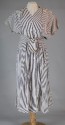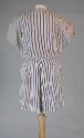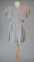 DescriptionPlaysuit with skirt. Two pieces. Cream with navy blue stripe nylon. Collarless bodice, inset waistband over shorts. Six button front placket. Split cap sleve. Separate skirt has three button front placket and then a five-button hidden placket. Waistband ties in front. Label : De De Johnson originals, made in California.