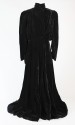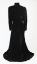 DescriptionBlack silk velvet evening coat lined in cream taffeta with inner lining of black flannel. Ruched stand-up collar and two ruched pockets. Sleeves pleated at cap. Button at neck and waist. Bodice bloused over slightly gored skirt.On View