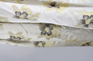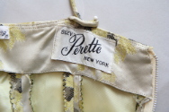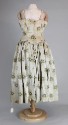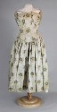 DescriptionEvening dress of grey/yellow/black brocade.  Bodice has shoestring straps and dropped waist.  Skirt is short gathered bouffant.  Back zipper.  Lined and two separate crinolines.  Label: Suzy Perette, New York.On View