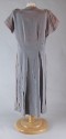 DescriptionGrey crepe afternoon dress. No collar, three large gold and "topaz" buttons on front opening. Cap sleeves. Skirt straight with front Fullness plus pulled in with front ties. Each shoulder has a large full bow of tubing with ends of Chinese knots.