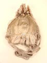 Description"Fanchon" bonnet, white corded silk, lace and embroidered ribbon. Poof of lace and ribbon under top brim. Back ruffle. Ties of fabric. Lined in white silk.On View