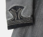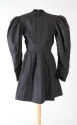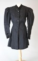DescriptionBlack wool finger-tip length coat. Trimmed around neck with black velvet and soutache braid. Sleeves full to elbow, fitted below with velvet and braid trim. V-neck. No collar, buttons to just-below waist. Skirt gored and full. Lined in black taffeta. Fabric worn off two buttons.On View