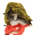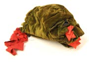 DescriptionBonnet of olive green velveteen. Separate ruffle trim across top. Cherry ribbon trim and ties. Back neck protector. Lined in grey wool plaid. Hand sewn.On View