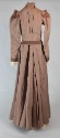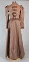 DescriptionTwo-piece light brown wool.A. Bodice has high collar with bands of brown narrow grosgrain ribbon with modified leg -of - mutton sleeves. Wrists have three bands of ribbon with lace.