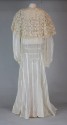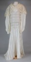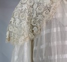 DescriptionCream cotton gauze with a wide satin horizontal stripe. Very large lace collar, long sleeves with cuff. Waist darts. Skirt of vertical stripes sewn to bodice with V's front and back at hip level.On View