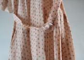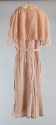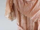 DescriptionPink "silk" crepe printed with tiny flowers in brown, green and dark pink.Large collar scalopped in green forms sleeves and a deep weighted V in front. Skirt of 1 1/4" gores attached at hip level in chevron pattern. Self belt has clear glass buckle.