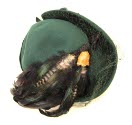 DescriptionGreen felt hat with asymetrical rounded half-brim. Round crown. Black and dark green iridescent feathers on right side. Half veil with chenille dots.Label : Mabel O'Neill, Burlington, VT