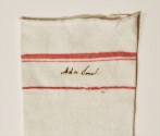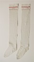 DescriptionWhite cotton machine knit, three pink stripes at top. Foot has heavy seams. Signed in black on top : "Ada Smith?"