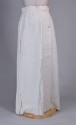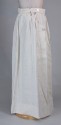 DescriptionWhite linen straight skirt. Flap with large pearl button in front and back. Back slightly gathered to waist band. Self belt with two large pearl buttons in back.Fastened in center front to skirt. Side closure of snaps.