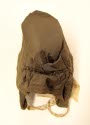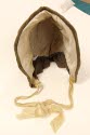 DescriptionBonnet, brown silk, white silk lining. Stays in brim. Back neck protector. Ribbon ties.On View