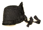 DescriptionBlack silk, quilted with ruching on brim. Back neck protector, ties.On View