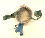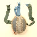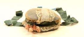 DescriptionBlue taffeta covered with natural organdy and lace. Spray of pink buds, blue ribbon trim and ties.On View