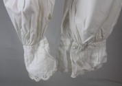 DescriptionWhite cotton eyelet ruffle and button cuff. Mend on left side patch mend.On View