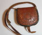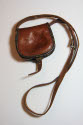 DescriptionPurse and coca bag. Small, horseshoe shaped. Buckles on bottom. Flap engraved with floral pattern. Long narrow leather strap. Three main compartments, two inner flaps. One small compartment in front with tab. Strap is adjustable.On View