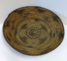 DescriptionBundled coil construction. Knotted coil start. Design of dark brown center, two concentric circles. Four evenly spaced fan shapes, and four truncated triangles beneath single dark brown circle. From there to the dark rim unevenly spaced truncated triangles. Shallow bowl shape. Stitches widely spaced (10 to one inch). Self-coiled rim finish.On View
