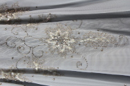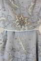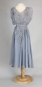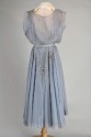 DescriptionNylon leno weave grey/blue sheer dress. Modified sweetheart neckline. Sleeveless. Bodice and hip area of circular skirt heavily beaded with brilliants, clear sequins and various crystal beads. Mostly hand sewn. Lined in the same fabric. Belt: self fabric, with sequins and beads.On View