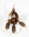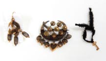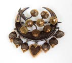 DescriptionBrooch: hair and gold plate with grape spray, 6 balls and one heart dangle. Grapes of light brown.