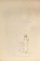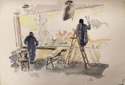 DescriptionMan and woman painting a wall mural of paired animals (Noah's Ark scene), with ladder and benches.Two-sided work, 1992.16.8 B on other side, ink drawing of two women in front of podium.