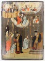 DescriptionNarrative scene depicting faithful accompanied by Angel before Priest in a room. Images in upper portion of panel depicting, 1. Angel and Faithful on a cloud, 2. Kingdom of Heaven?, 3. two angels, two apostles and holy spirit.On View