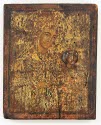 DescriptionMadonna wearing a gold robe with green trim, bearing halo, holding Christ child with halo.On View