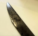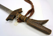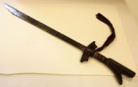 DescriptionCampilan, or kampilan, Malayan sword. Long, single-edged blade (edged on straight side of blade). Holes punched on curved side of blade. Carved wooden guard and handle. Cloth streamer tied to the grip.