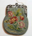 DescriptionGrey silk background, flowers in multi-colored wool. Round shape-same both sides. Square silver frame with filigree leaf pattern. Twist knob closure. Rings for handle Stamped "800". Lining of grey silk, ruched edging.On View