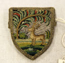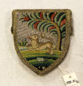 DescriptionEmbroidered on linen with silk and metal threads inlaid and couched work and French knots. Picture of lion on one side and stag on other. Outlined in metallic braid. Square metal pinchbeck frame with hooked catch. Rust velveteen on sides. Lining of green silk.On View