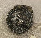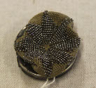 Description"Tam O'Shanter" purse of taupe knitted with eight point star of steet beads. Silver plated frame has art nouveau design of female bust. Probably hand made.