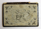Folding card case inside. Initials PFN and PPC. Inside written "Thiffan(?)" Fabric embroidered and ink design.