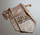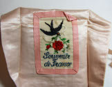 DescriptionPink satin bag with pointed bottom. Tunnel with pink ribbon pulls and ruffle. Embroidered patches on each side outlined in pink satin ribbon. Black bird holding red rose "Souvenir de France" in blue. Back has pink, white and blue striped ribbon outlining "1919" embroidered in flag colors of France, Great Britian, U.S.A. and Italy and embroidered violets.