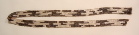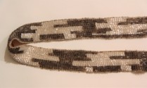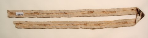 DescriptionOne of two beaded strips, probably trim on 1920's dress or a later period. Cream silk crepe with bugle beads in cream and silver in a geometric pattern. Sewn on with latch hook. Edging of clear seed beads. Raw edges just turned under.On View