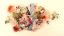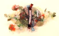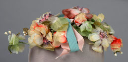 DescriptionSmall oval of netting covered with flowers in pale yellow, reds, brown and greens. Flat bow in middle of pink and blue grosgrain ribbon. Pearl stamens stick up. Two combs to fasten to hair.On View