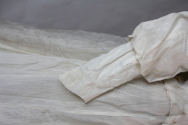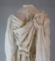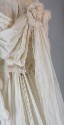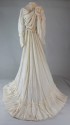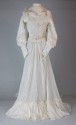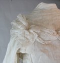 DescriptionCream pongee silk. Bodice of plain and embroidered stripe silk. Striped silk forms front and back yoke. Has a high neck. Plain silk is tucked and draped across the front. Bodice has front opening. Silk chiffon is draped across the back and over the shoulder and forms a large pouff on the left shoulder, with two long streamers. Sleeves are slightly full ending in fitted forearm of embroidered silk. Front has Edwardian pigeon breast shape. Lined in cotton with metal stays. Skirt is gored and darted in front. Gathered in center back. Center back opening. Deep ruffle with small double ruffle on top and a slight train.On View