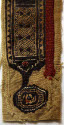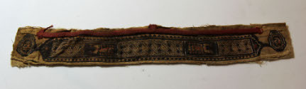 DescriptionTapestry woven and embroidered band that was used to decorate clothing. Stemmed pendant on each end. Thick red braid sewn on one side, natural false braid woven in on either side. Two male block figures with interlacing motifs in center and ends. Crenallated design on edge. Brown on natural with red and green.On View