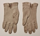 DescriptionBeige short gloves. Bow of leather on top of wrist. Split under wrist has rolled facing.Goes with dress 1998.13.1