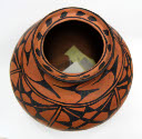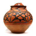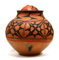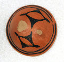 DescriptionSlip painted red with black designs. Concave bottom. Two covers, both with E "606" on them. One has geometric designs and the handle is broken off and missing. One with handle intact has four bird designs. Chipped on underside.