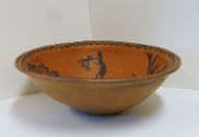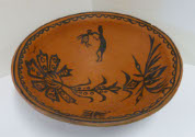 DescriptionBlack on red. Extended lip, flat bottom, interior design open scallops around rim, flowers, man holding bird by neck and (see accession card for design) in interior; exterior is tan.On View